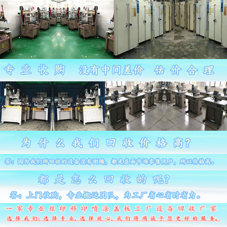 终年长时间收回二手丝印机二手移印机、烤箱、千层架、滚印机、烫金机,热转印机、镭雕机、激光打标机、主动打孔机、覆膜机、模切机、开料机、流水线、风淋室、UV机、拉网机、工业烤箱、千层架、晒版机、螺杆空压机、生产线、主动喷涂线、五金拉、喷油拉、超声波清洗机、清洗架、喷码机、精雕机、钢化炉、丝印网框、移印机配件、手印台、FFU等周边印刷设备、喷油设备、盖板设备、移印厂、丝印厂、维护片厂、工厂整厂设备。